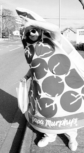 “It’s a slice of life,” said Dave Rowley on Thursday, as he stood in his pepperoni pizza costume outside the Oak Harbor Post Office, acting cheesy. Only his face was clearly visible through a hole in the pizza crust.