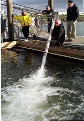 The truckload of fish came from the Washington Department of Fish & Wildlife’s Marblemount hatchery. Within minutes of the truck’s arrival the fish were being pumped through aluminum piping into two holding pens at Oak Harbor Marina where they will be raised for the next three months.
