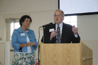 Washington State Transportation Secretary Paula Hammond and her cohort David Moseley, assistant secretary of transportation for Washington State Ferries, spoke about the problems with the Keystone-to-Port Townsend ferry run at the lunchtime meeting in the Coupeville Recreation Hall.