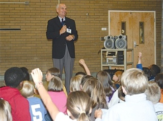 Jake Garn visited students at Broad View Elementary School Wednesday morning to talk about his experiences serving as a payload specialist for the space shuttle Discovery during a mission in 1985.
