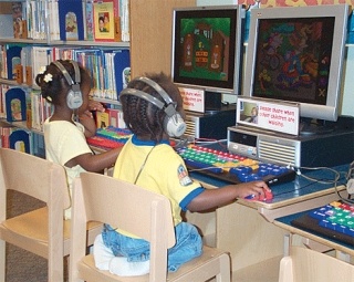Computers are linked to Paint programs, Dora the Explorer educational games and Tumble Books, a read-along collection.