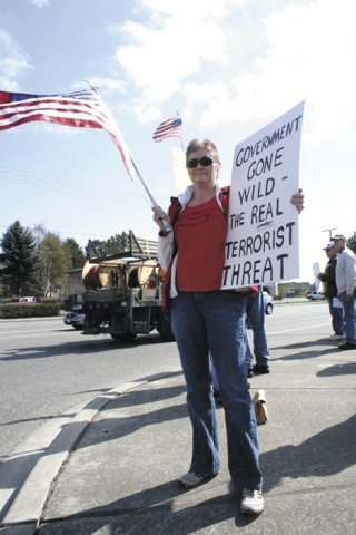 Oak Harbor resident Pam Tomlinson was on the corner in front of Jack and the Box. She was traveling to Bellingham to participated in that city’s tea party.
