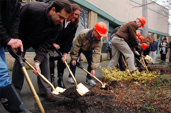 Armed with gold-painted shovels, Oak Harbor dignitaries and members of the public launched the historic downtown restoration project March 1 by digging into a flower garden near the intersection of SE Dock Street and Pioneer Way.