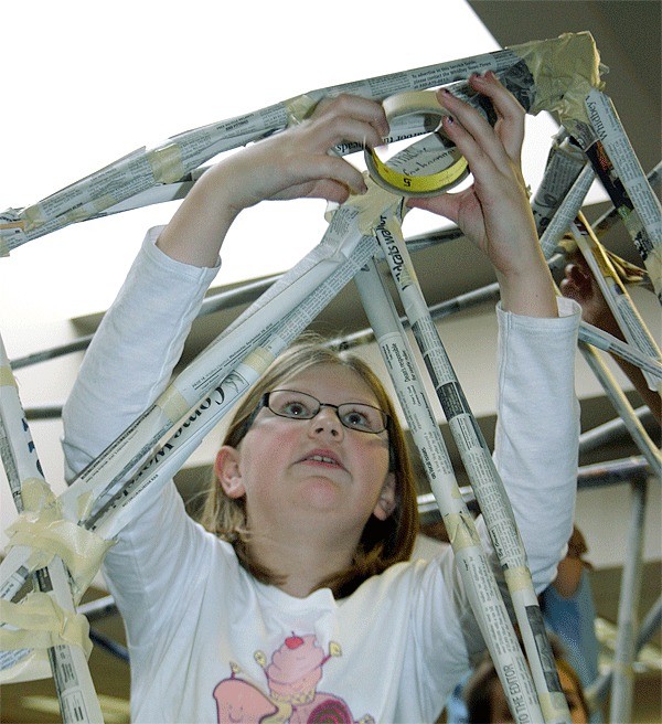 He got the idea for the project from a Seattle school that did it last year. He divided the class into teams, each of which created more than 300 newspaper tubes using nearly a mile of the local newspaper. Then the groups got to work following blueprints, figuring out how to tape tubes together and learning how to measure the diagonals of triangles, Toulgoat said.