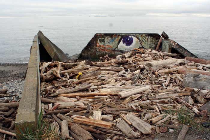 The two slabs of concrete are remnants of a bulkhead that washed away years ago. Several different types of graffiti currently adorn the concrete, including words, symbols and a giant eyeball.