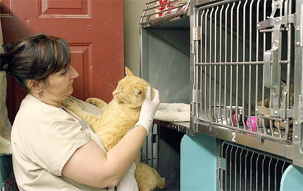 Donna Dunn plays with a cat while cleaning the cages crammed into Oak Harbor’s undersized animal control shelter Tuesday morning. She is the lead animal care technician.