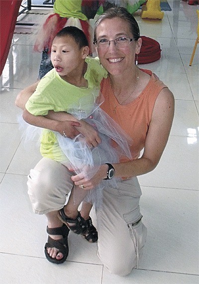 Toni Crebbin takes time to share with a special-needs orphan in Chaoyang