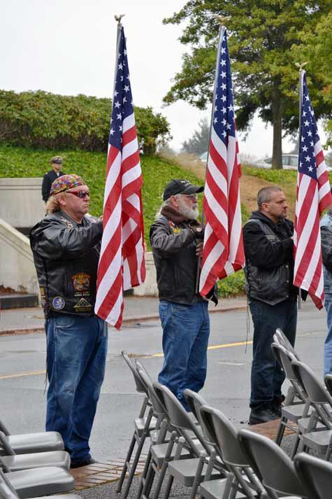 More than 100 members of the Patriot Guard Riders roared up the hill on motorcycles before the ceremony began, having participated in a road rally in honor of National POW/MIA Recognition Day. Several of them stood in formation with flags during the ceremony. A light drizzle gave way to a light mist, eventually dissipating as the low-hanging clouds lightened as the service went on.