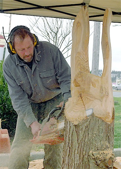 “Buzzsaw” Bob Halverson, a Whidbey-based woodcarver, fired up his chainsaw to carve an eagle from a piece of red cedar.