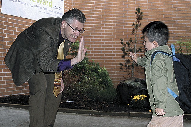 New Oak Harbor schools superintendent Lance Gibbon greets a student at Crescent Harbor Elementary School Thursday.