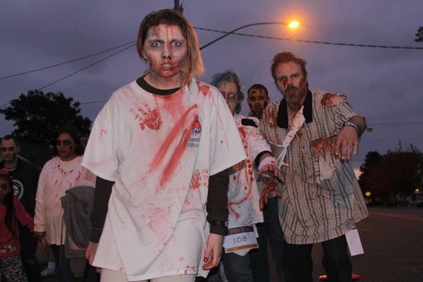 The Karels’ and Chris Phillips did not break character during this past weekend’s Zombie Crawl in Oak Harbor. They slunk their way down Midway Boulevard with rest of the pack, groaning and advancing on living bystanders, just like the extras you’d see on a horror movie set.