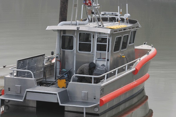 The 32-foot emergency response vessel, built by North Cross Aluminum, was recently put into the water in Oak Harbor and piloted to Langley where it will be permanently moored. The boat is not finished, however, and each day past the Jan. 1 delivery deadline could cost the builder $400 in late fees.