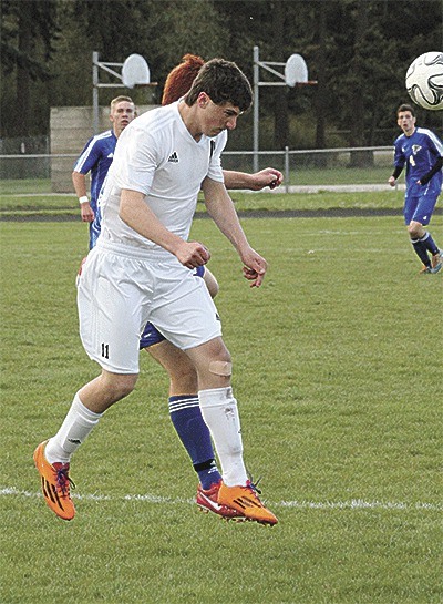 Coupeville's Tanner Kircher uses his head to direct the ball in the Wolves win over South Whidbey Friday.