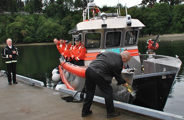 South Whidbey Fire/EMS’s new fireboat was christened in a ceremony at South Whidbey Harbor Saturday morning. About 50 people attended the event, including a handful of fire district, port and city elected officials. The actual christening, accomplished with a bottle of champaign, was performed by Clinton resident and former fireman, Lanny Workman.