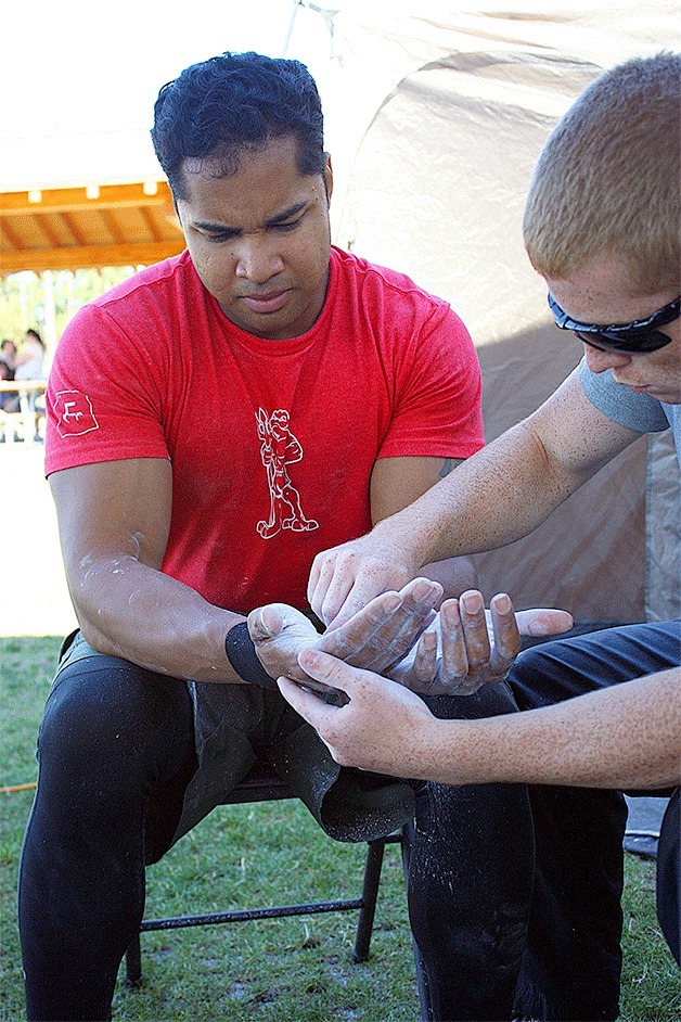 Instead of wrapping his hands or wearing gloves, which would have created tear-inducing moisture, McCastle used grip pads. Still, his hands began to blister and peel several hours into the event, which was treated with a fast drying chalk.