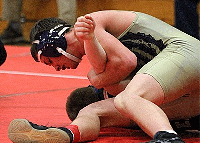 Zach Aketch takes down Marysville-Pilchuck’s Justin Collier on the way to a 9-3 win. Photo by Jim Waller.