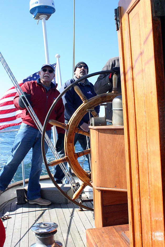 Saia and his father, Gerry, took turns at the helm of a boat, named Suva, built in 1925, experiencing the history of the schooner, how she handles on the water, and her strengths and limitations.