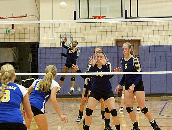 Claire Anderson (12), right, watches as her hit heads to the back corner for a kill. Photo by Jim Waller.