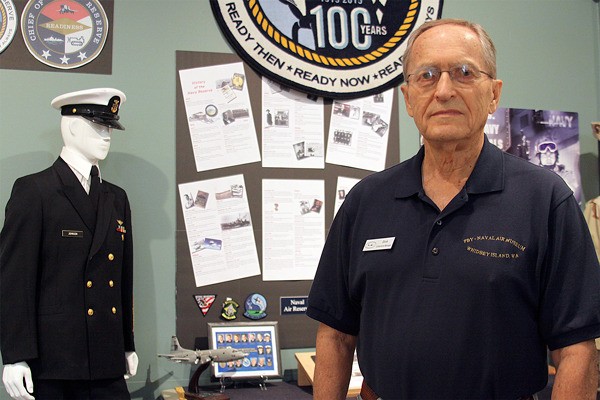 “Those are my suspenders,” Johnson said, motioning to a pair of red straps dangling from a pipe that are holding up a giant emblem that is part of a display honoring the Navy Reserve’s 100th anniversary at the PBY Memorial Foundation Museum in Oak Harbor.