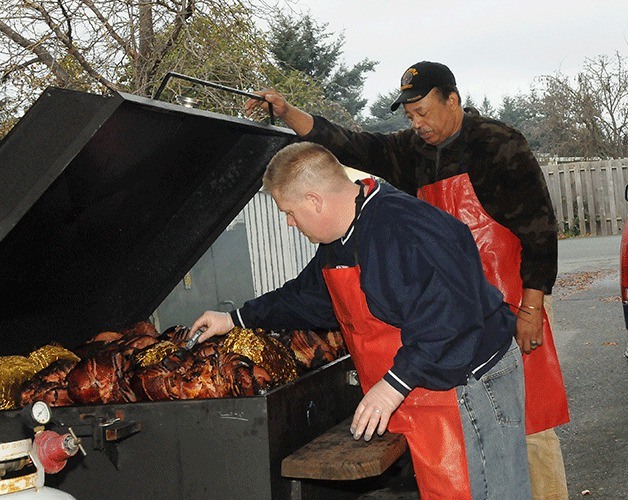 Outside, starting early in the morning, 165 turkeys and 800 pounds of ham will be prepared. About 90 of the turkeys will be deep fried, while the rest will be smoked.