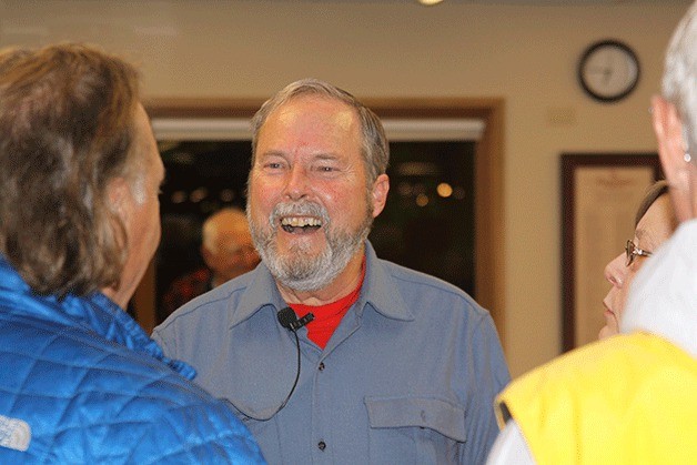 Lee James visits Ken Pickard and Kay Foss after his talk about the Pratt art collection at the Coupeville Library Dec. 7. An exhibit will be featured at the library this month.