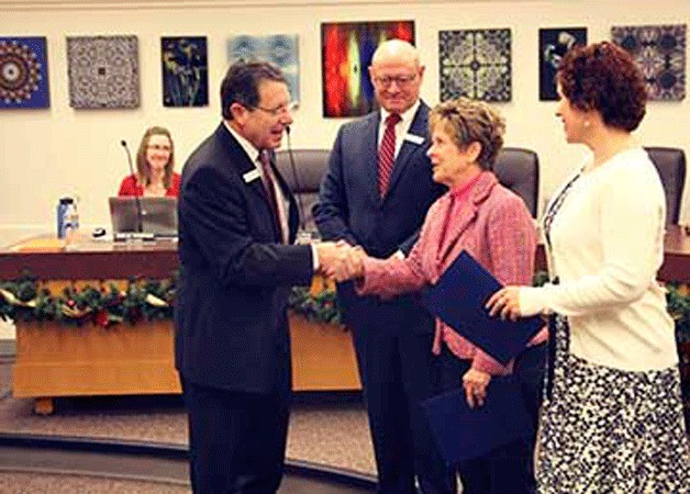 Ironically, the ceremony was led, lightheartedly, by Bill Hawkins, who is both an Island County district court judge and the Oak Harbor municipal court judge. He previously worked closely with the council as the city’s attorney until he was sacked by Mayor Scott Dudley during a controversial round of firings of top city officials.