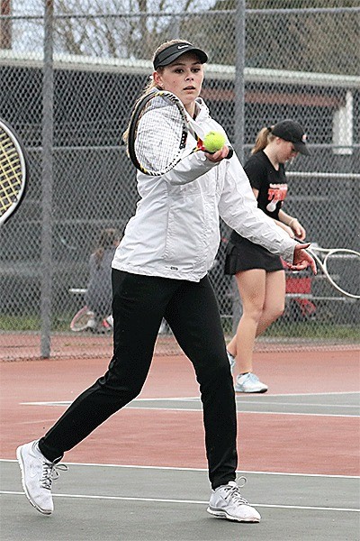 Valen Trujillo collected a 6-4, 6-0 win in first singles; while the first and second doubles teams of Peyton Aparicio/Sage Renninger (6-2, 6-0) and Jazmine Franklin/McKenzie Bailey (6-4, 6-3) also won.