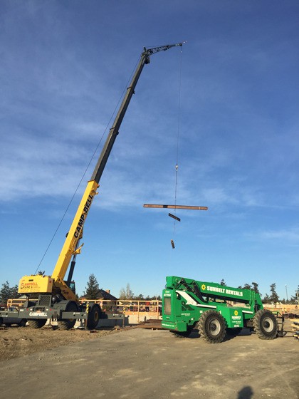 Workers erected the first steel beams and passersby should notice the skeleton of the building going up in the coming weeks from as far away as State Highway 20.