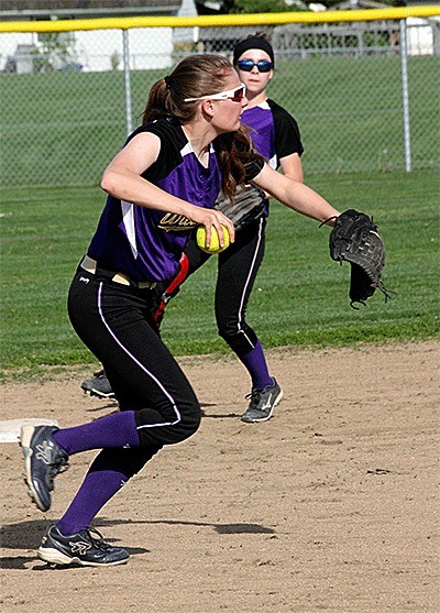 Oak Harbor shortstop Alexa Findley prepares to throw to first after fielding a ground ball Tuesday as second baseman Brooke Wilson looks on.