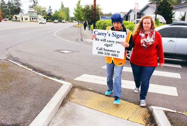 He’s driven to the intersection of Whidbey Avenue and State Highway 20 in Oak Harbor. He straps on a protective helmet, slips into an orange safety vest and grabs his moneymaker, a sturdy white sign that proclaims: “Carey’s Signs. We will carry your sign!!”