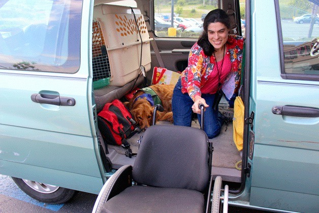 She pulls open the side door, and points at the back seat. Her service dog Tanner, a golden retriever with a fluffy tail, hops into a kennel in the back of the van and patiently watches. Mitchell positions her chair in front of the opening and pushes herself forward headfirst into the van. On her hands and knees she scoots around, pulls the chair in and shuts the door. Then she crawls into the driver’s seat.