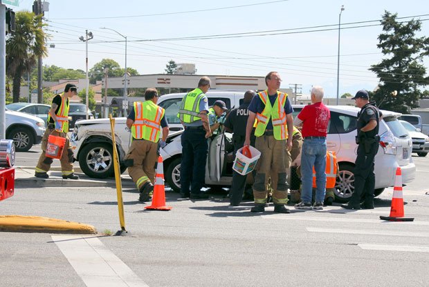 Traffic was briefly gummed up in Oak Harbor this morning after two cars collided at the intersection of the highway and Barrington Drive just before 11 a.m.