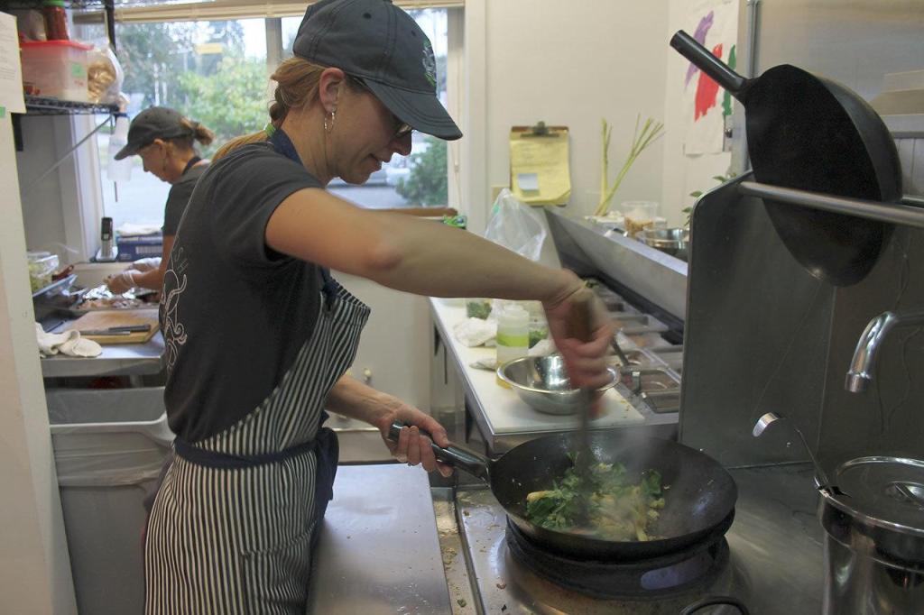 Co-owner Stephanie Pendell quickly whips up noodles in a wok.