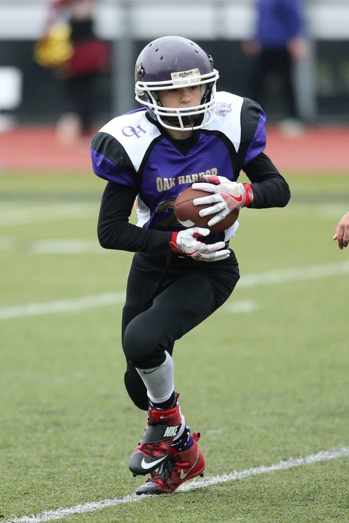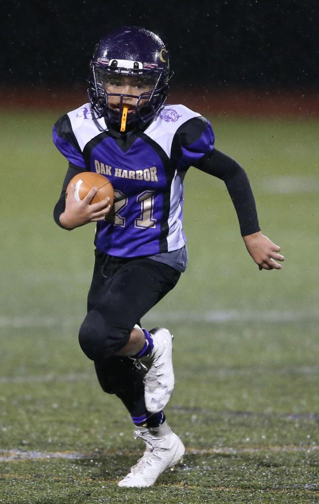 Cameron Asinsin tossed scoring passes to Jaden Brown and Corbin Taylor, Caden Leckelt raced 60 yards for another score and Tre Johnson added a short TD run for Oak Harbor.