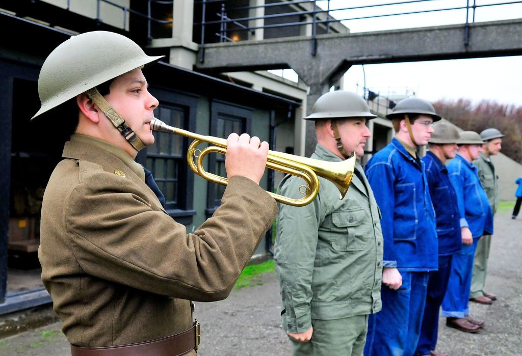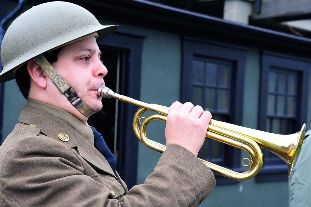 Ethan Lane, a music teacher from Marysville, plays a bugle to sound the call to assembly at Fort Casey State Park Saturday for the 9th Coast Artillery District, a living history group that focuses on bringing together pieces of actual history into a collection for the public to experience at various forts and historical locations throughout the Northwest. Photo by Michael B. Watkins/ Whidbey News-Times.