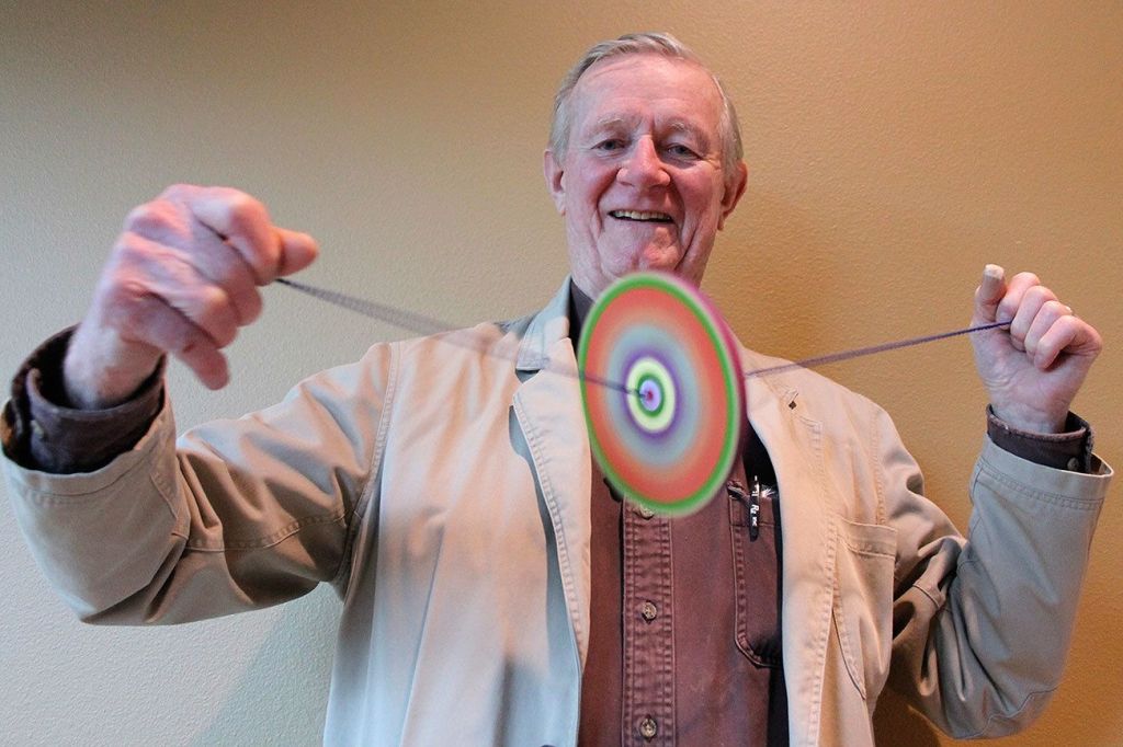 While buttons, bottle caps and other light and circular objects are typically used for the centerpiece, Rose uses what he calls “junk wood,” or scraps of wood that he picks up across South Whidbey. He says he hasn’t bought any wood since starting to make the toys four years ago. Yet he always keeps his eyes peeled for local or irregular woods to sand and polish. As he has continued to make the toys, he’s progressively used heavier or more oddly shaped pieces, and will even put two centerpieces on one piece of twine. He also began painting geometric shapes with vibrant colors onto the toys that change color when spun. For example, he has made numerous red and blue colored branch spinners that turn purple when spun fast. It’s all part of the educational aspect Rose emphasizes.