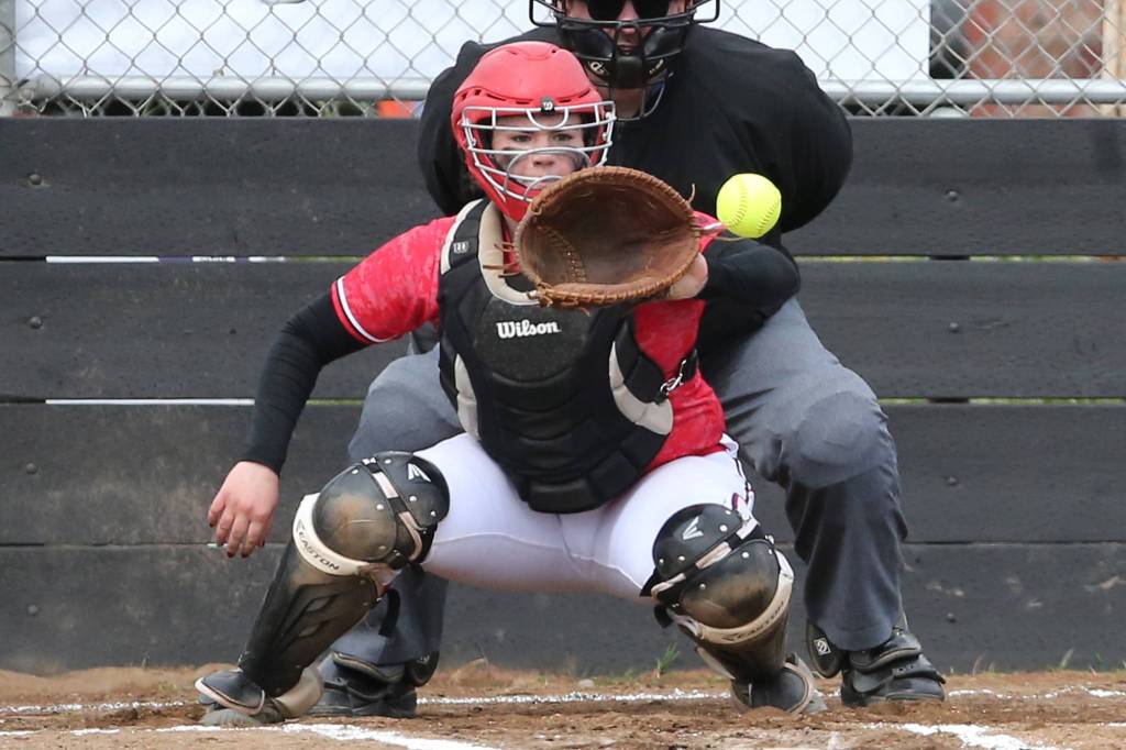 Coupeville’s Jae LeVine shows bunt as Vashon Island catcher Hannah McArthur prepares to receive the pitch. (Photo by John Fisken)