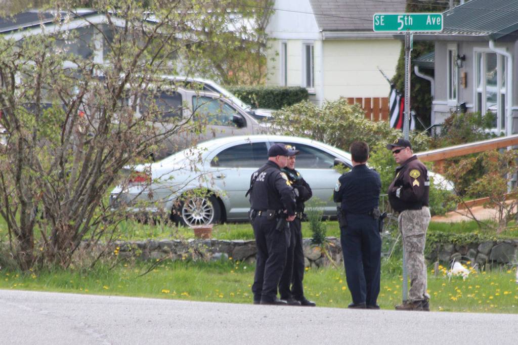 Oak Harbor police officers talk near the site of a standoff Wednesday. (Jessie Stensland / Whidbey News-Times)