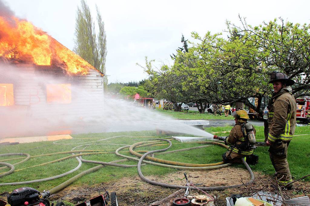 Photo by Jessie Stensland / Whidbey News-Times                                Firefighters practice putting out a fire at a practice burn on the west side of Oak Harbor last weekend.
