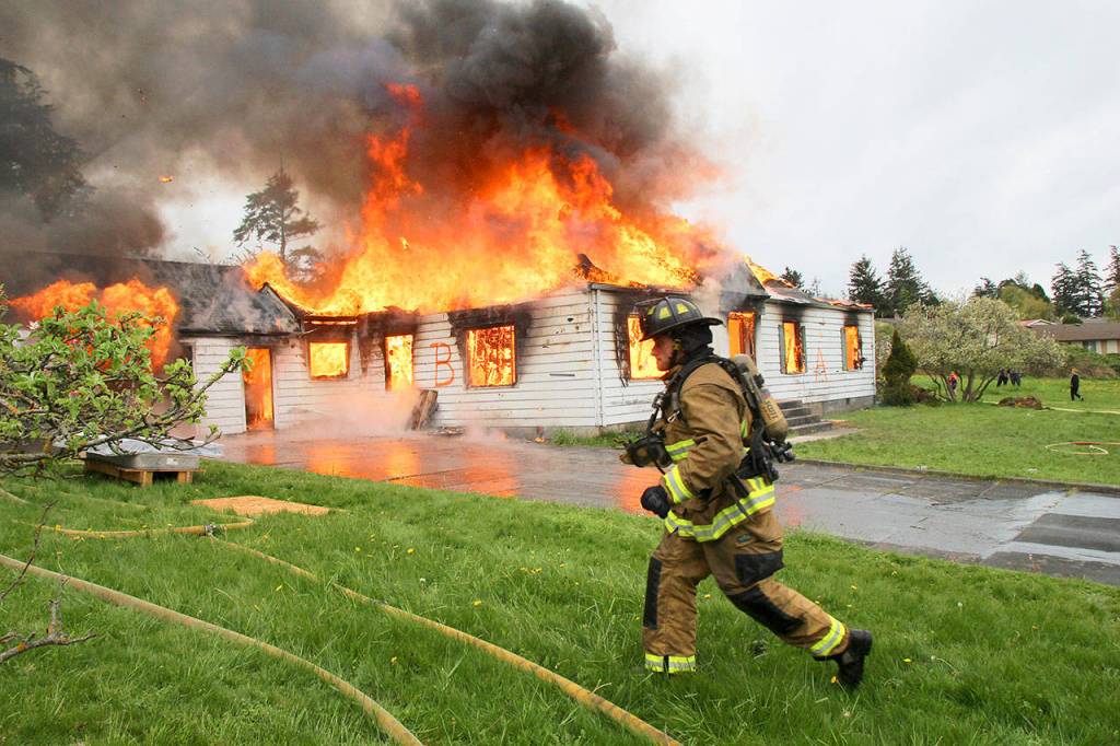 Photo by Jessie Stensland / Whidbey News-Times                                A firefighters hurries by a house in flames during a burn on the west side of Oak Harbor last weekend.