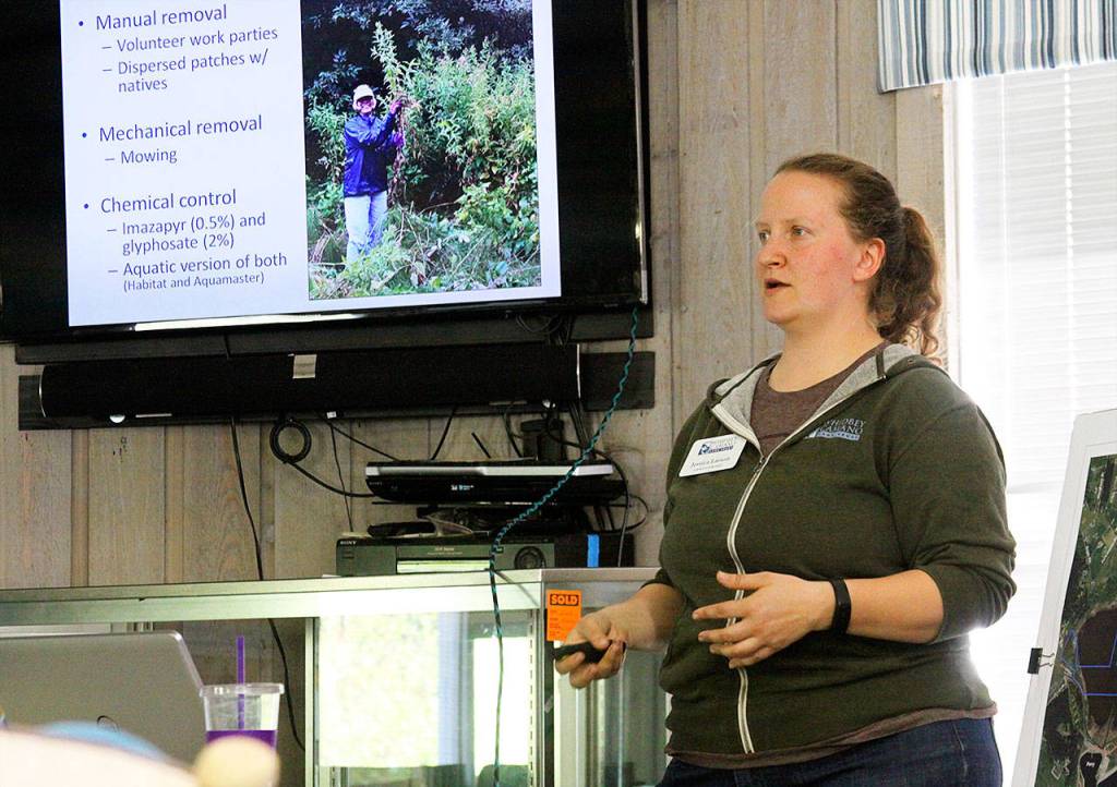 Larson gave a presentation to nearby residents at the Admiral’s Cove Beach Club shelter last week, outlining the land trust’s three-year plan to remove hairy willow-herb, along with other noxious weeds such as blackberries, poison hemlock and thistle.