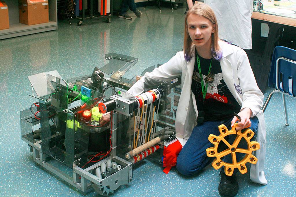 Tristen Klein, a junior, and Marcus Carman, a sophomore, demonstrated their team’s robot, which took 14th in the Washington/Idaho/Alaska district robotics competition.