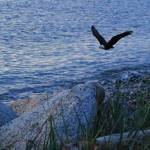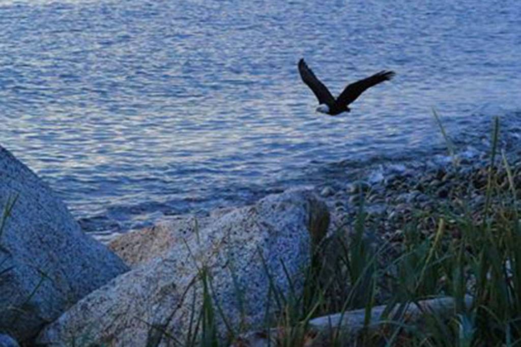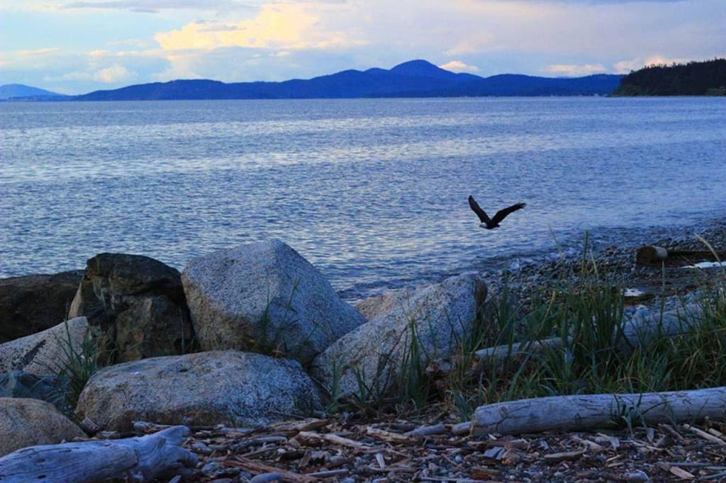 With Mount Erie in the background, one of the resident eagles of Joseph Whidbey State Park flies over West Beach May 12. Photo by Diana Brown