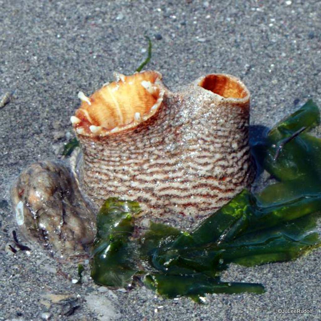 I didn’t think much of it at the time because there were too many creatures new-to-me to become obsessed with just one. At home, I Googled “brown” “squirt” “sea creature.” The search turned up “tunicate.” Kozloff‘s (p 31) description seems to fit what I found, “more or less cylindrical and abruptly cut off,” “rather solid and firm,” “the size and shape of the openings and the siphons subject to muscular control.” During a -2.0 foot tide this spring, I returned to Cornet Bay to track down the tunicates, which was like trying to finding a needle in a haystack. Each set of siphons is small, no more than an inch wide by two inches long, and the beach is 30 feet wide and a mile long. After wandering around for awhile, I eventually found and photographed them.