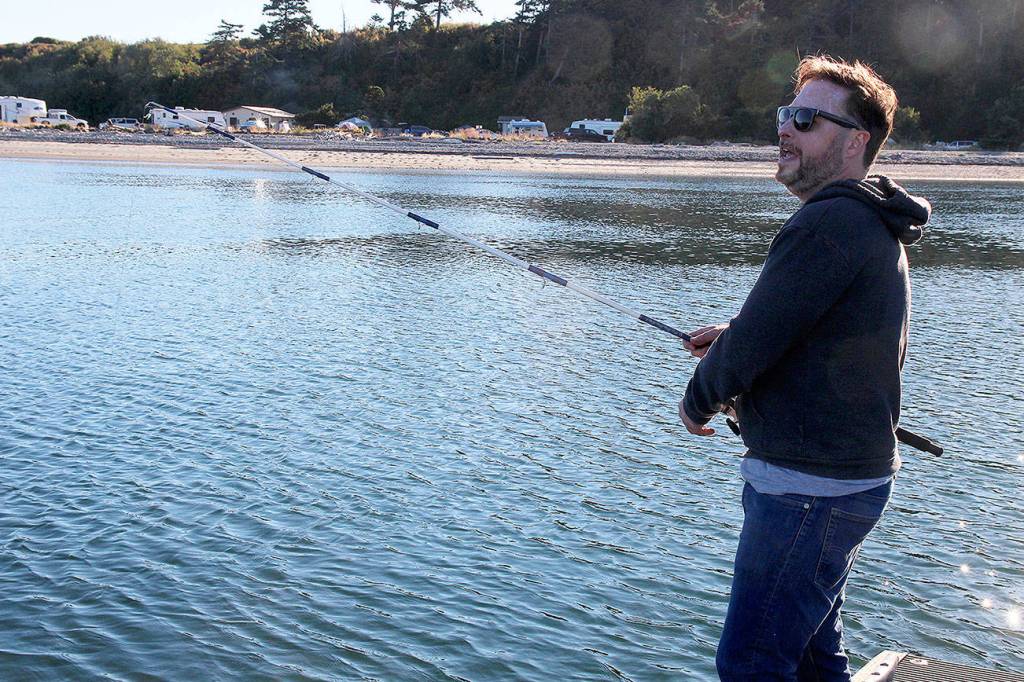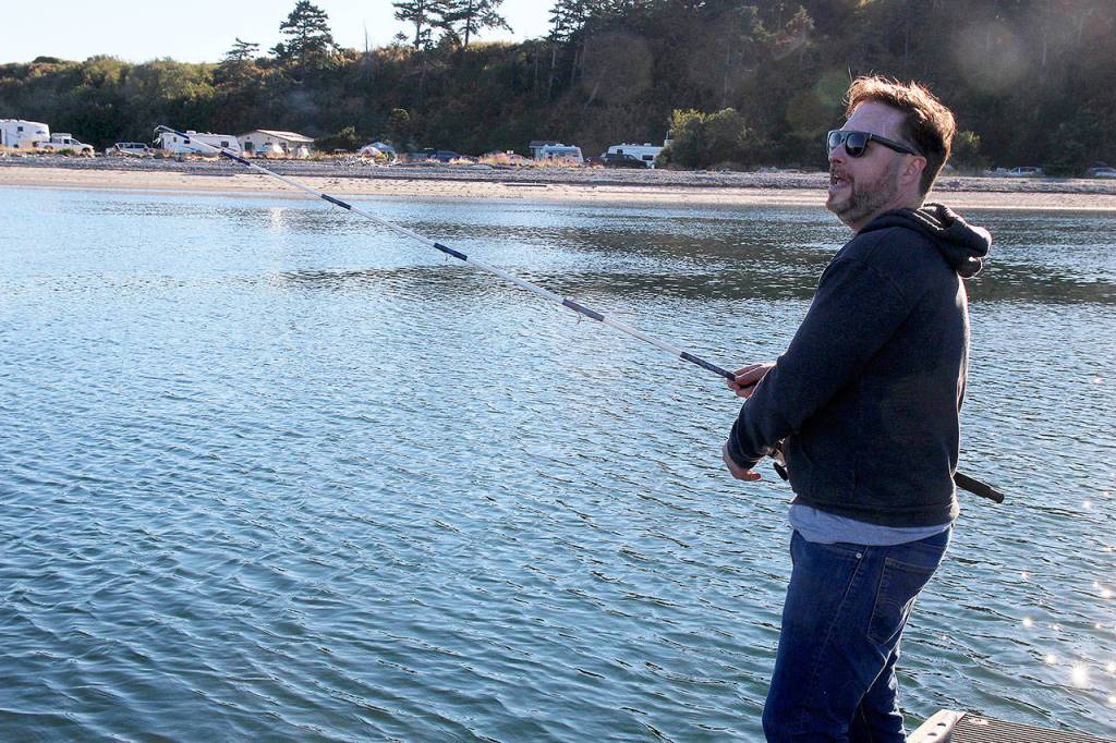Monday at dusk, Brian Corbett casts his line from a dock near Coupeville Ferry Landing. Nothing came back, no pinks, no silvers, no dinner. “I guess we’re just out here fishing for compliments,” said the visitor from New Jersey. Photo by Patricia Guthrie/Whidbey News-Times