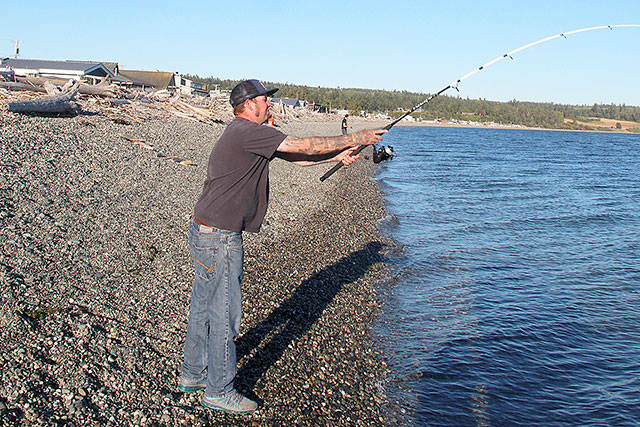 Andrew Score tries his luck at catching pink salmon Monday evening, casting off from Driftwood Beach Park. “If it was a good season, there would be 100 guys lining the beach,” he said. There were five. And a happy sea lion a few yards out. Photo by Patricia Guthrie/Whidbey News-Times