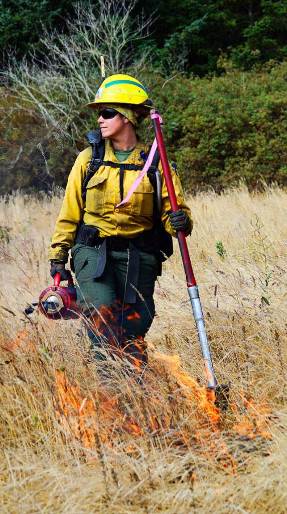 Michelle Boderck, from the Center for Natural Lands Management, assists Thursday with a controlled burn at the Admiralty Inlet Natural Area Preserve. The burn is part of the Whidbey Camano Land Trust’s effort to restore prairie lands on the island. Photo by Laura Guido/Whidbey News-Times