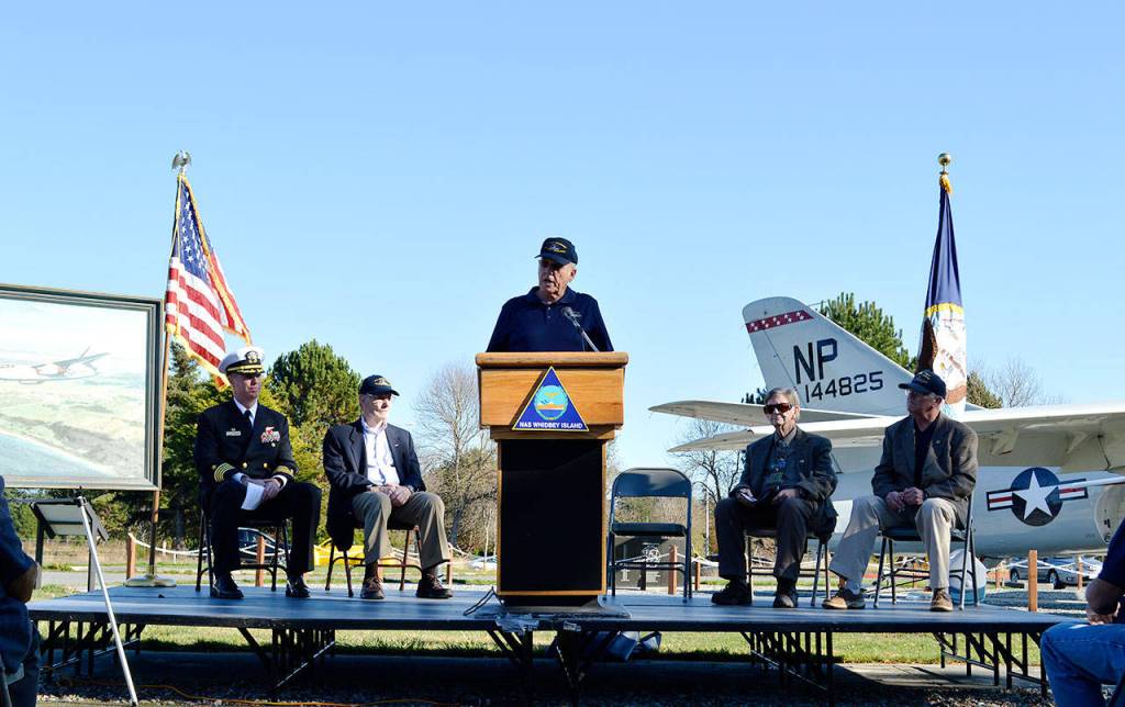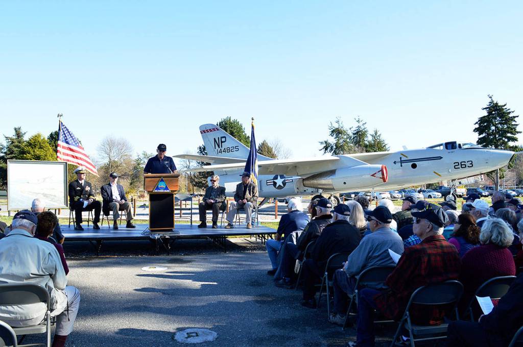 The dedication took place near Langley Gate in front of the memorial display, put in place by the A-3 Skywarrior Whidbey Memorial Foundation.