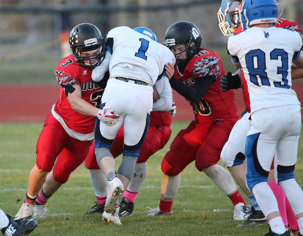 Hunter Downes, left, and Shane Losey, right, help bring down Chimacum’s Peyton Hundley.(Photo by John Fisken)