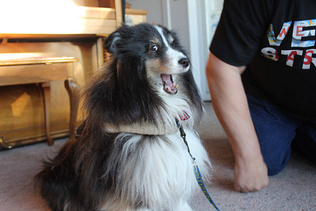 Gary Hammer and therapy Shetland sheepdog, Nitro, recently returned from Las Vegas where they traveled to comfort victims after the city’s mass shooting. Nitro is also a service dog for Kathy Hammer. The couple live in Greenbank where Nitro sometimes gets to be a plain pet dog. Photos by Patricia Guthrie/Whidbey News-Times